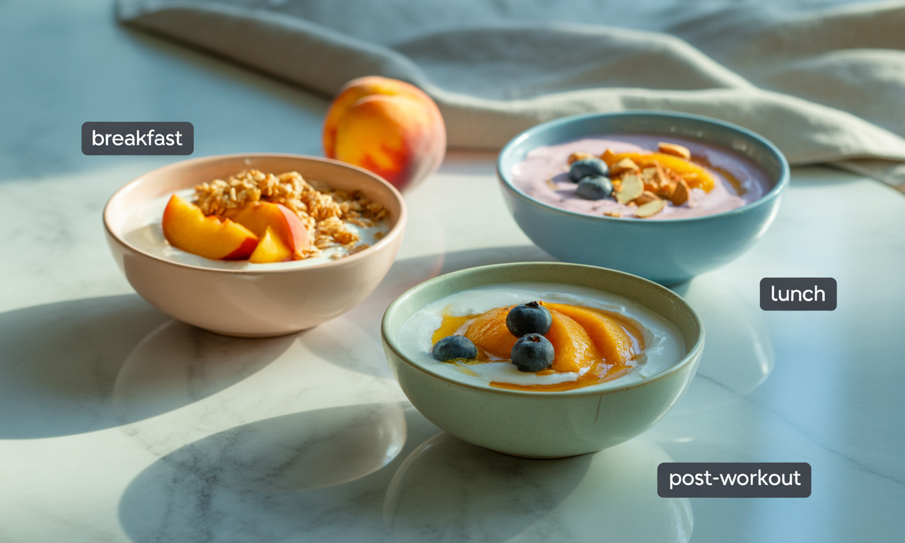 가장 좋은 조합은 ‘플레인요거트 + 신선한 복숭아 + 약간의 견과류’입니다.